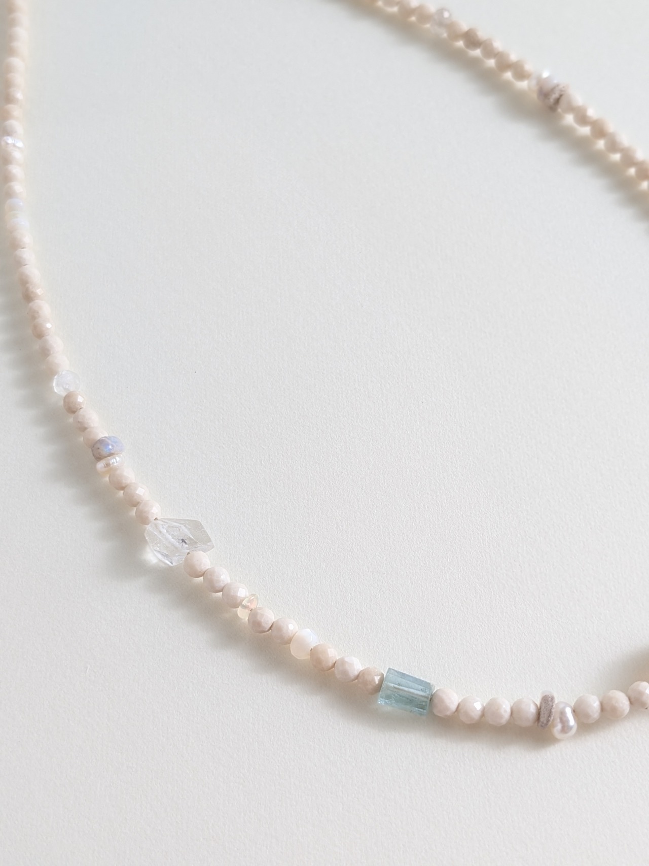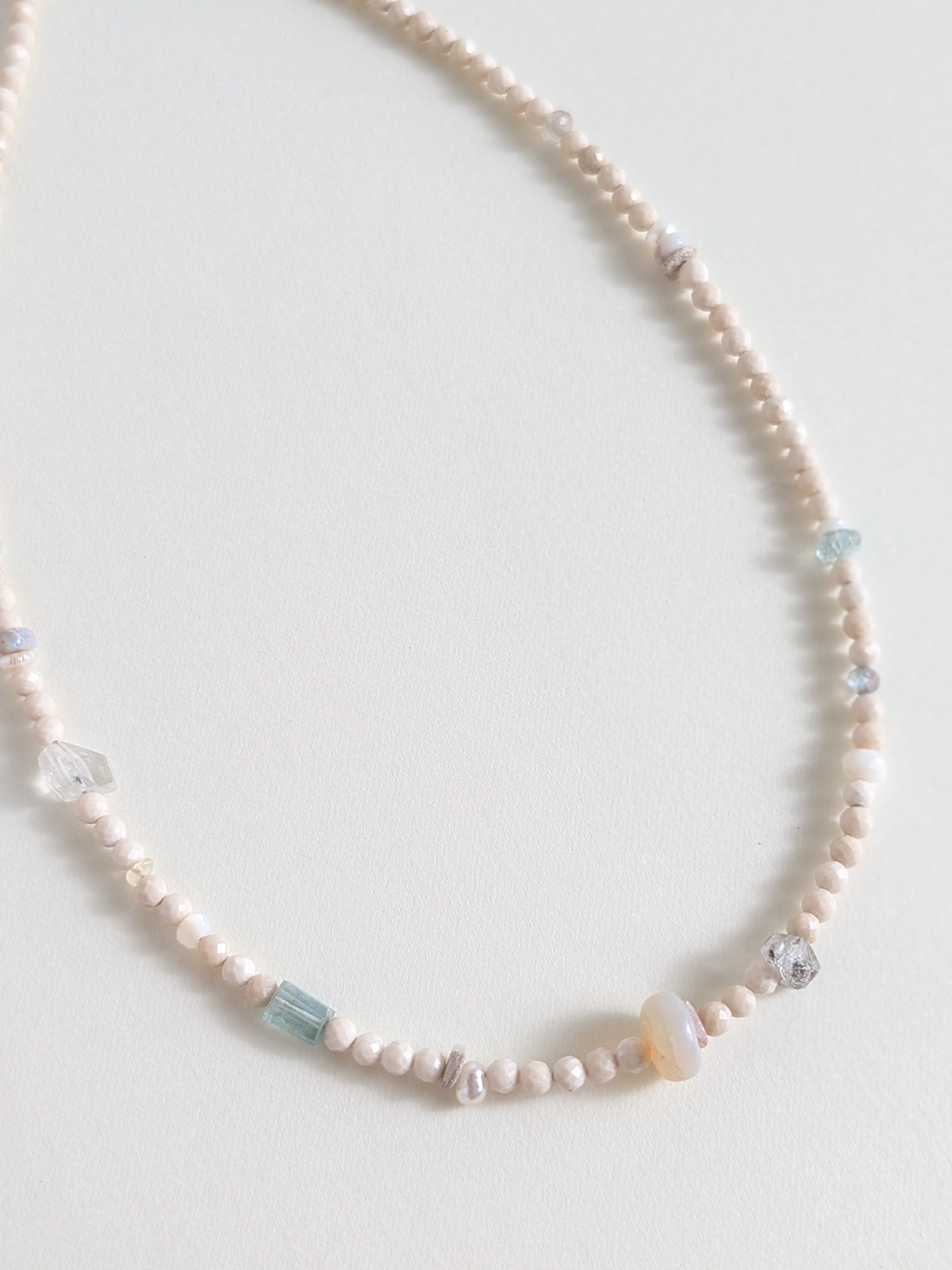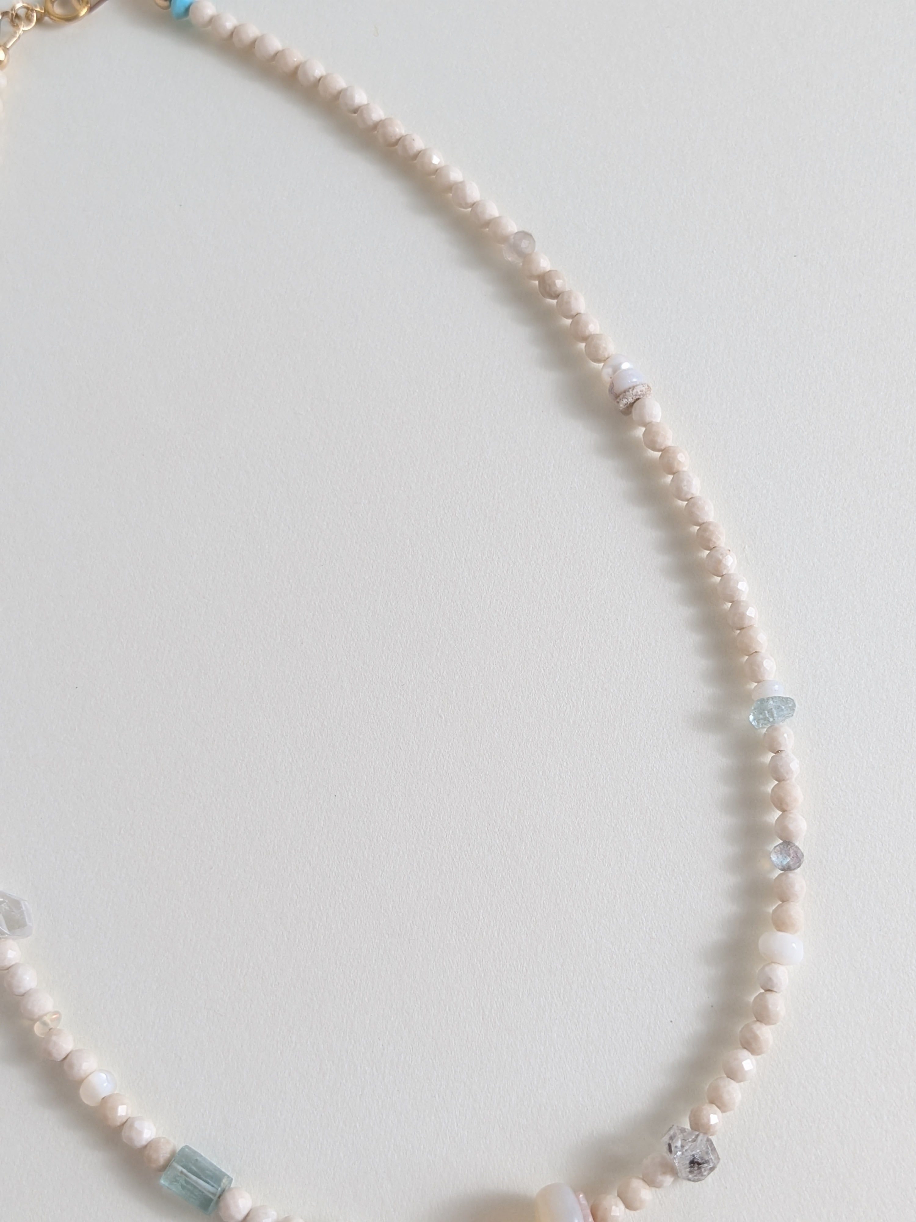 ほんのり温かみのある色合いのリバーストーンをベースに、アクアマリンやオパール、ムーンストーンなどをアクセントとして合わせたチョーカー。