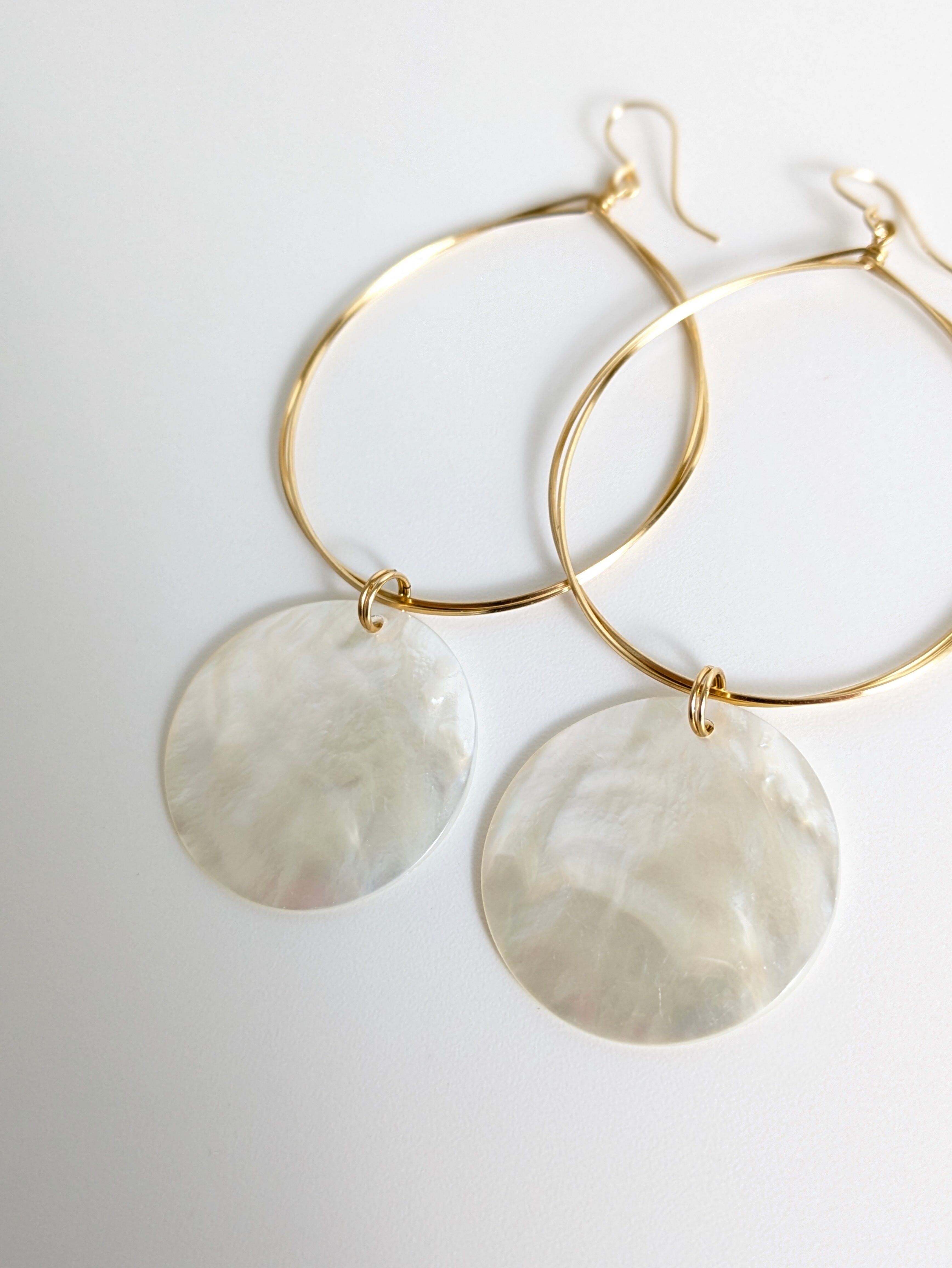フープの先に表情豊かな白蝶貝をあしらったピアス。